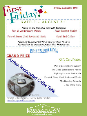 Summertime Raffle tickets are on sale at Port of Leonardtown Winery, Fuzzy Farmers Market, North End Gallery, and Fenwick Street Used Books and Music - $1 each or 12 tickets for $10. Prizes include gift cards from LBA businesses and a Grand Prize - a gorgeous, hand-crafted coffee display table built by artisan carpenter Rob Seltzer of Herring Creek Furniture, www.herringcreekfurniture.com/galleryMain.html. Raffle prizes will be displayed on a rotating basis at local participating businesses. Go to www.leonardtownfirstfridays.com for more information and the display schedule. Many thanks to Herring Creek Furniture, Port of Leonardtown Winery, Good Earth Natural Foods, Big Larry’s Comic Book Café, Brewing Grounds, and Fenwick Street Used Books and Music for their generous prize donations.