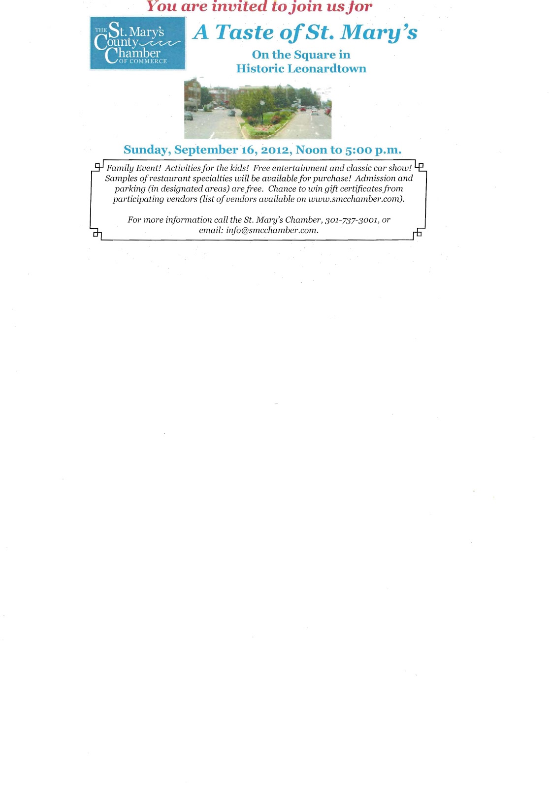 Information tables for LBA members like Craft Guild Shop and the Leonardtown Arts Center, as well as Medstar St. Mary’s Health Connections, will be set up in the Square.