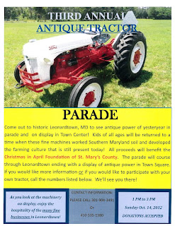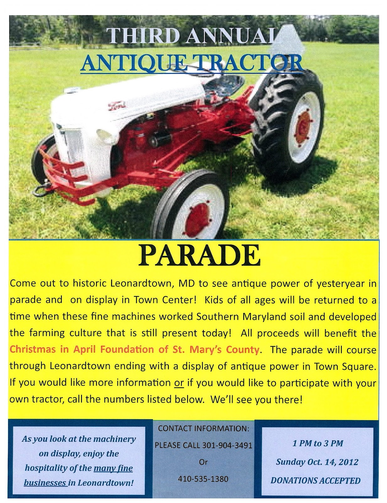 The parade will course through Leonardtown ending with a display of antique power in Town Square. If you would like more information or if you would like to participate with your own tractor, call the numbers listed below. We'll see you there!