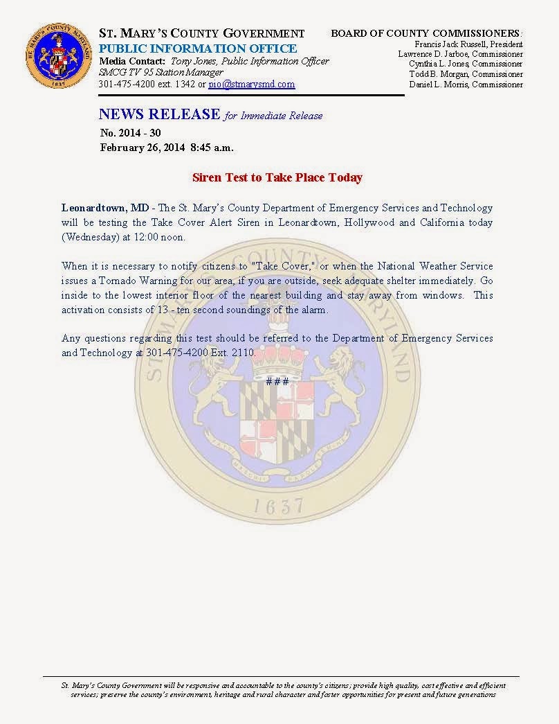 Leonardtown, MD - The St. Mary’s County Department of Emergency Services and Technology will be testing the Take Cover Alert Siren in Leonardtown, Hollywood and California today
